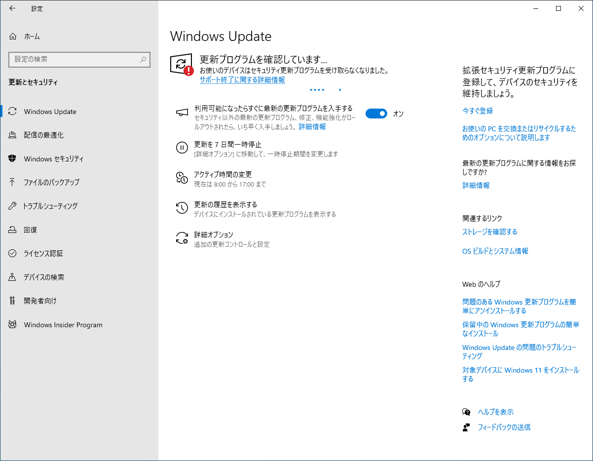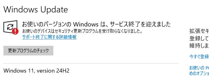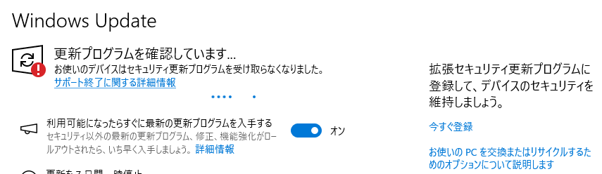 PCを再起動したりWindows Updateの「更新プログラムをチェック」を行ったりしていると、拡張セキュリティ更新プログラム(ESU)への登録の案内も表示された(次の画像の赤枠内)。