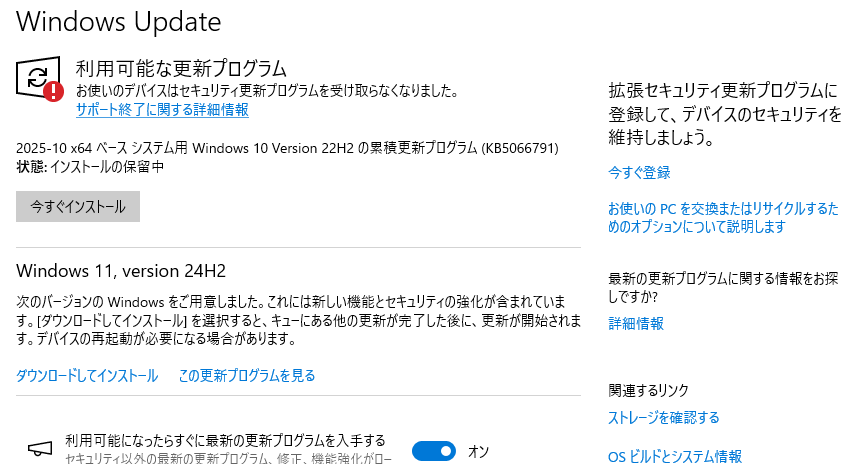 一通り、Windows Updateが終わると、しばらくして拡張セキュリティ更新プログラム(ESU)への登録の案内は表示されたが、その時点ではWindows11へのアップグレードの案内は表示されなかった。