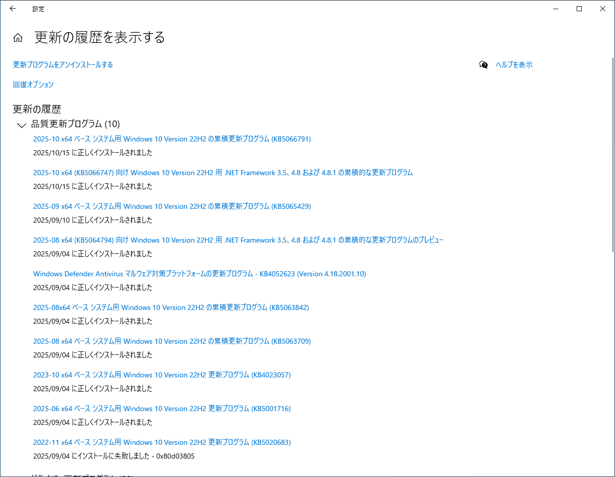 しばらくすると、更新プログラムの確認が終わり、2025-10 x64 ベース システム用 Windows 10 Version 22H2 の累積更新プログラム (KB5066791)がインストールできるようになった。