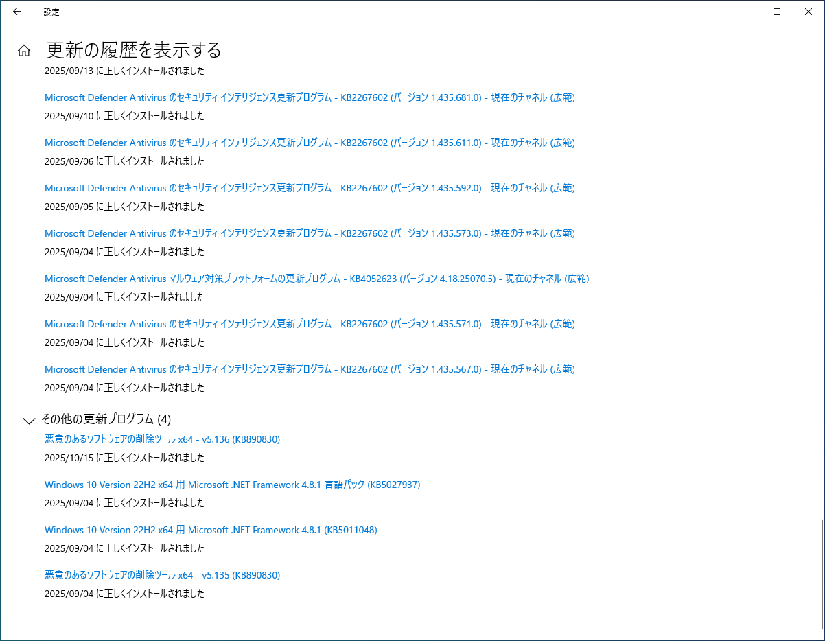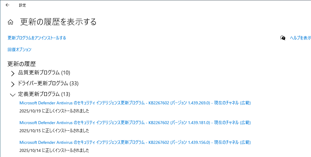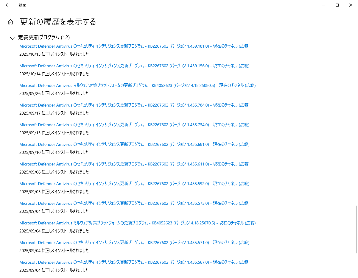 Microsoft Defenderのマルウェア定義ファイルは更新されているようだ。(2025/10/19)
